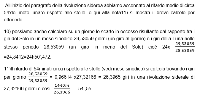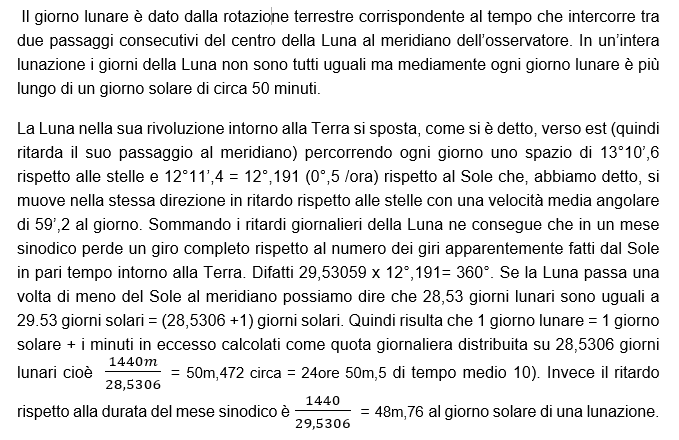 13) All’inizio del paragrafo si è visto che 28,53 giorni lunari per 50m,5 corrispondono a 24h solari, quindi moltiplicando 3,5662 x 50m,5= 3h equivalenti al ritardo dopo un’elongazione di 45°.
