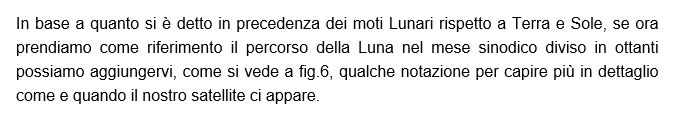 Il ritardo riguarda sia il passaggio al meridiano superiore che le ore del sorgere e del tramontare che sono legati alla latitudine dell’osservatore e alla declinazione del satellite12). Dopo 3,7 giorni solari (vedi fig.6) (per la precisione 28,53:8=3,5662 giorni lunari)13), siamo al primo ottante dove la Luna presenta 45° di elongazione vediamo un quarto di disco che si mostra come una falce con gobba a ponente e tre quarti appaiono, se visibili in particolari condizioni, di un colore grigio scuro (detto luce cinerea 14). La luna passa al meridiano alle 15 con un ritardo di circa 3 ore, infatti, è sorta 6 ore prima alle 9 e tramonta alle 21. Dopo 7.4 giorni siamo al Primo quarto, elongazione 90° est e gobba a ponente la Luna è in quadratura orientale fig.2, 6 e 7. Sorge a mezzogiorno dove passa quando il Sole è al tramonto, fig. 7. Si vede nella prima parte della notte indicativamente dalle 18 alle 24. Segue il secondo ottante e dopo siamo al Plenilunio. La Luna piena, passati 14,8 gg dal novilunio, si trova in opposizione al Sole con 180° di elongazione, ed è in ritardo di 12 ore rispetto al Sole: sorge al tramonto del Sole; quindi, si vede dalle 18 alle 6, passa al meridiano alle 24. Nei giorni successivi la Luna ritarda sempre più fino al terzo ottante, sono trascorsi 18,5 giorni dal Novilunio, dove ha 15h di ritardo (12+3) o se si vuole 9h d’anticipo sul prossimo Novilunio riducendo la parte illuminata finché giunge in quadratura occidentale 90°ovest. Dopo 22,1giorni la luna è all’ Ultimo quarto la Luna in ritardo di 18 ore e si trova ad ovest del Sole (gobba a levante) lo anticipa al meridiano di 6 ore, infatti, sorge quando il Sole è a mezza notte ed è osservabile dalle 24 alle 6 del mattino prima che sorga il Sole. Infine, la Luna si avvicinerà al Sole riducendosi ad una piccola falce con gobba a levante visibile al mattino fino a congiungersi con lo stesso al Novilunio completando il mese sinodico dopo un giro di 360° intorno alla Terra precisamente in 29,53059 giorni solari medi.