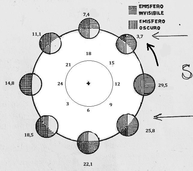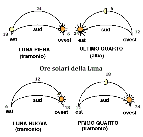 Prendiamo come riferimento la direzione sud dove il Sole passa a mezzogiorno (detta anche meridiano dell’osservatore) ed esaminiamo le più significative fasi lunari delle quali si è già anticipato a grandi linee nell’introduzione. Dopo il Novilunio la Luna, che era in congiunzione con il Sole, si sposta verso levante alla velocità angolare di 12°,19 al giorno (per 29,53 giorni solari) di elongazione dal Sole, cui corrisponde il ritardo giornaliero di 50m,5 rispetto al passaggio del Sole.