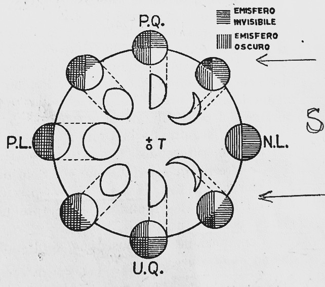 Fasi Intermedie (Quarti): Nei quarti (primo o ultimo), la Luna si trova a 90° (in quadratura) rispetto alla Terra e al Sole. Al primo quarto è in fase crescente (quadratura orientale) e si mostra come limitata nella parte esterna da una semicirconferenza (terminatore semicircolare) con la convessità (volgarmente gobba) rivolta a ponente. Sorge a mezzogiorno e tramonta a mezzanotte. All'ultimo quarto elongazione 270° (quadratura 90° occidentale) la Luna è a ovest del Sole in fase calante con gobba a levante, il processo è invertito. Sorge a mezzanotte e tramonta a mezzogiorno. Entrambe mostrano il terminatore ellittico interno che si è ridotto a un diametro. Nelle altre fasi intermedie la Luna in vicinanza stretta al novilunio si presenta a forma di sottile falce col terminatore semicircolare che volge la convessità verso ponente o levante a seconda della fase rispettivamente crescente o decrescente e all’interno una concavità ellittica descritta dal terminatore ellittico. In prossimità del plenilunio il terminatore ellittico descrive la parte convessa mentre quello semicircolare indica sempre la fase.3) In fase intermedia crescente si vede a occidente, mentre in fase calante la vediamo a levante.