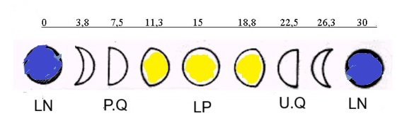 Con il grafico se siamo in grado di valutare i giorni che mancano al plenilunio non c’è bisogno di calcolare l’angolo lunare basta fare una semplice somma o sottrazione. Sempre per semplificare torniamo alla situazione precedente. La meridiana segna le 13 e siamo al P.Q. che è una fase di facile individuazione dove mancano 7,5 giorni al plenilunio, il grafico dice di sottrarre 6 ore alle 24+1= 25-