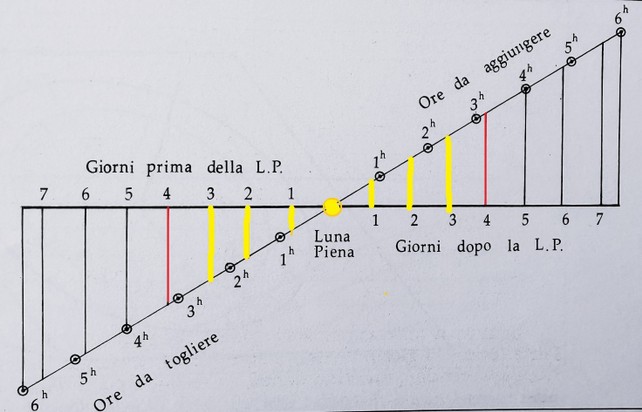 Il grafico è impostato sul passo di 48’ di ritardo giornalieri per lunazione di 30 giorni e 1,25 giorni per ora di angolo lunare fino al limite di 4 ore per 5 giorni